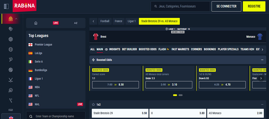 La 15e journée de Ligue 1 s’ouvre ce vendredi 5 décembre avec un duel intéressant entre le Stade Brestois et l’AS Monaco, au Stade Francis-Le Blé. L’enjeu est important pour les deux camps : Brest veut grimper dans la première moitié du tableau, tandis que Monaco vise un retour provisoire dans le top 5. Du côté des parieurs, la plateforme Rabona met en avant plusieurs cotes particulièrement attractives pour cette affiche.
